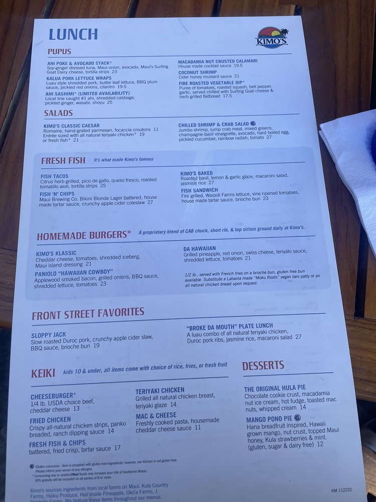 Introducing the menu at Kimo's Maui, a delightful seafood bar located at 845 Front St in Lahaina, HI. Known for its casual yet classy atmosphere, Kimo's is perfect for groups and families alike, offering food that celebrates the flavors of Hawaii.